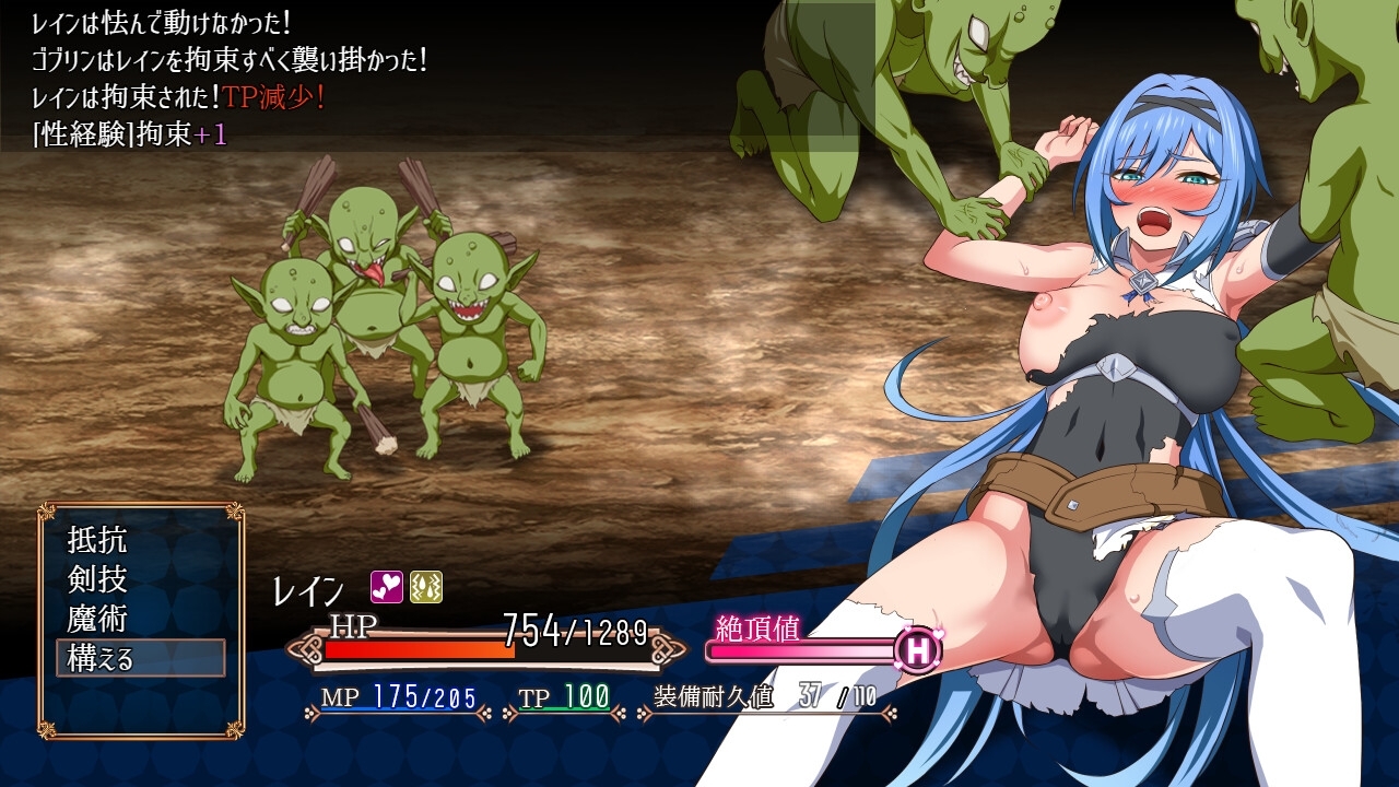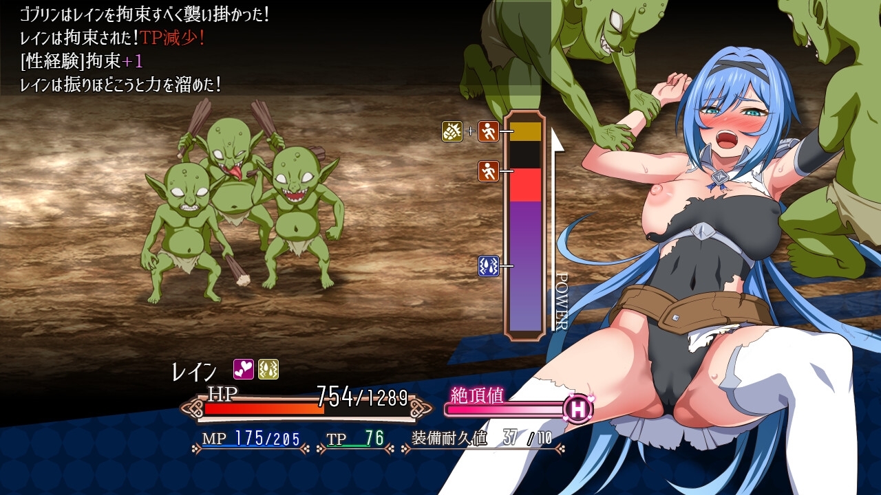 特定の敵はレインを拘束し、身動きを取れなくしてきます。早く脱出しないと敵はレインを凌○し続け、”発情”や”絶頂”状態にされてしまいます。