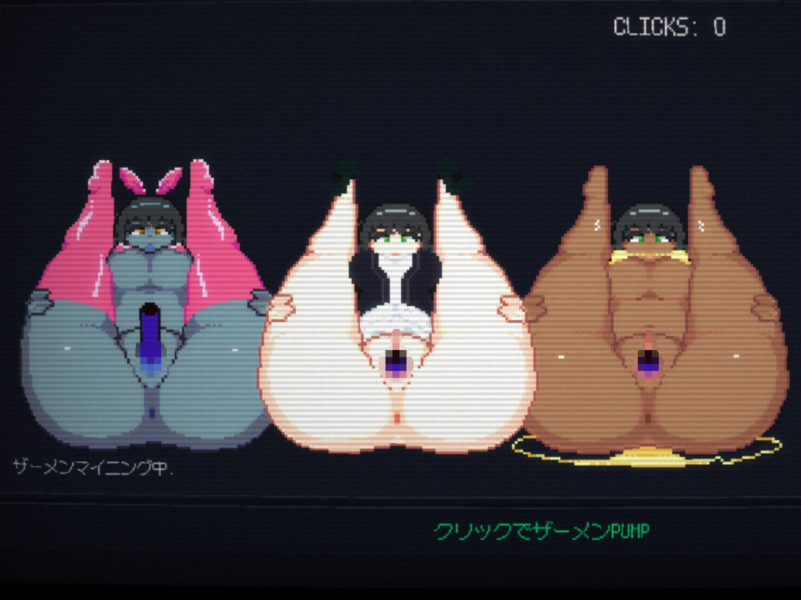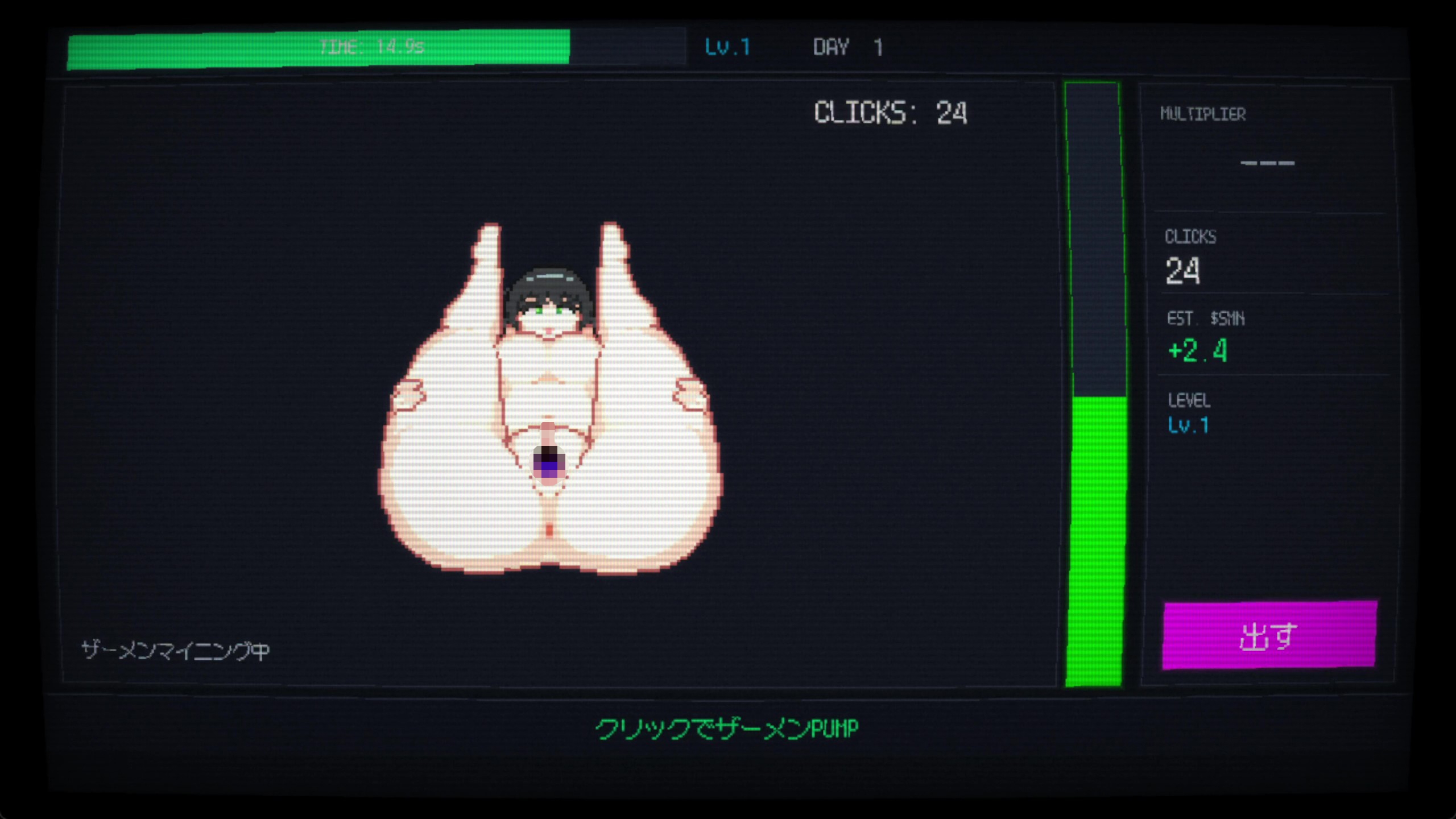 画面をクリック(タップ)しまくってゲージを溜め、制限時間内に大量のザーメンを射精。
