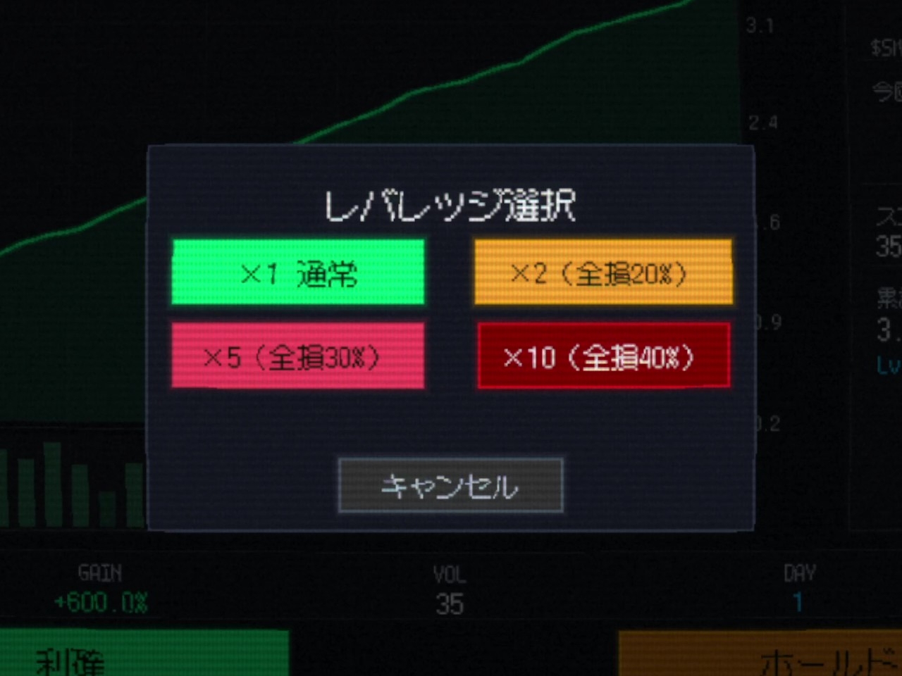 2. トレード(プレイパート) — 25秒間、ひたすらクリック!ゲージが溢れるたびに倍率UP(×1→×2→×3…)